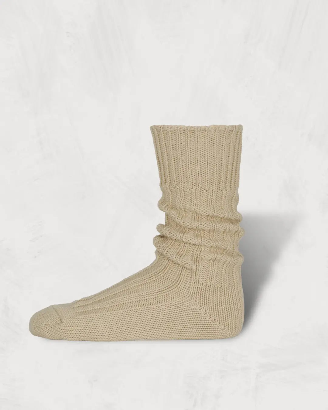 decka® Quality socksのシグネチャープロダクトの5thコレクション。一般的なソックスの約5倍の太さの糸を希少な機械で編み立ており、耐久性を持たせながら、締め付けない優しい履き心地を追求した。